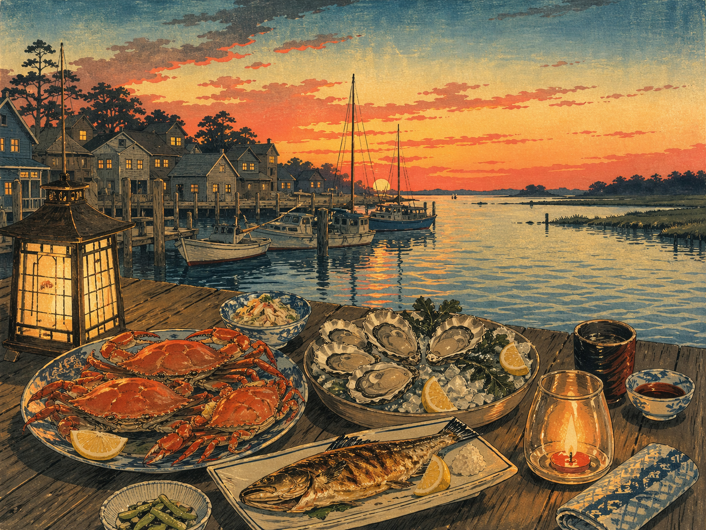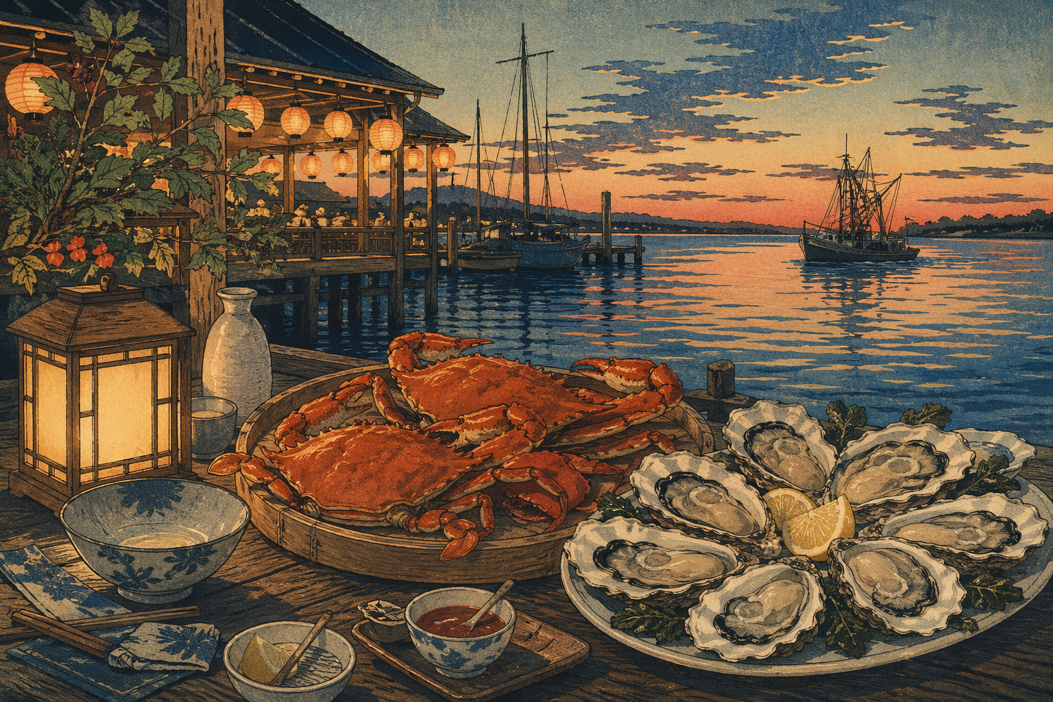 食、代表作、食卓、蟹、牡蠣、水辺、ランタン